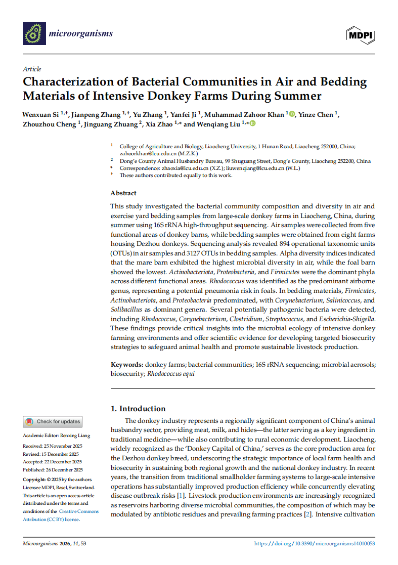 情色小说 2024级动物学专业研究生司文轩在《microorganisms》杂志上发表了题为“Characterization of Bacterial Communities in Air and Bedding Materials of Intensive Donkey Farms During Summer”的研究论文,指导教师刘文强教授、赵霞博士。