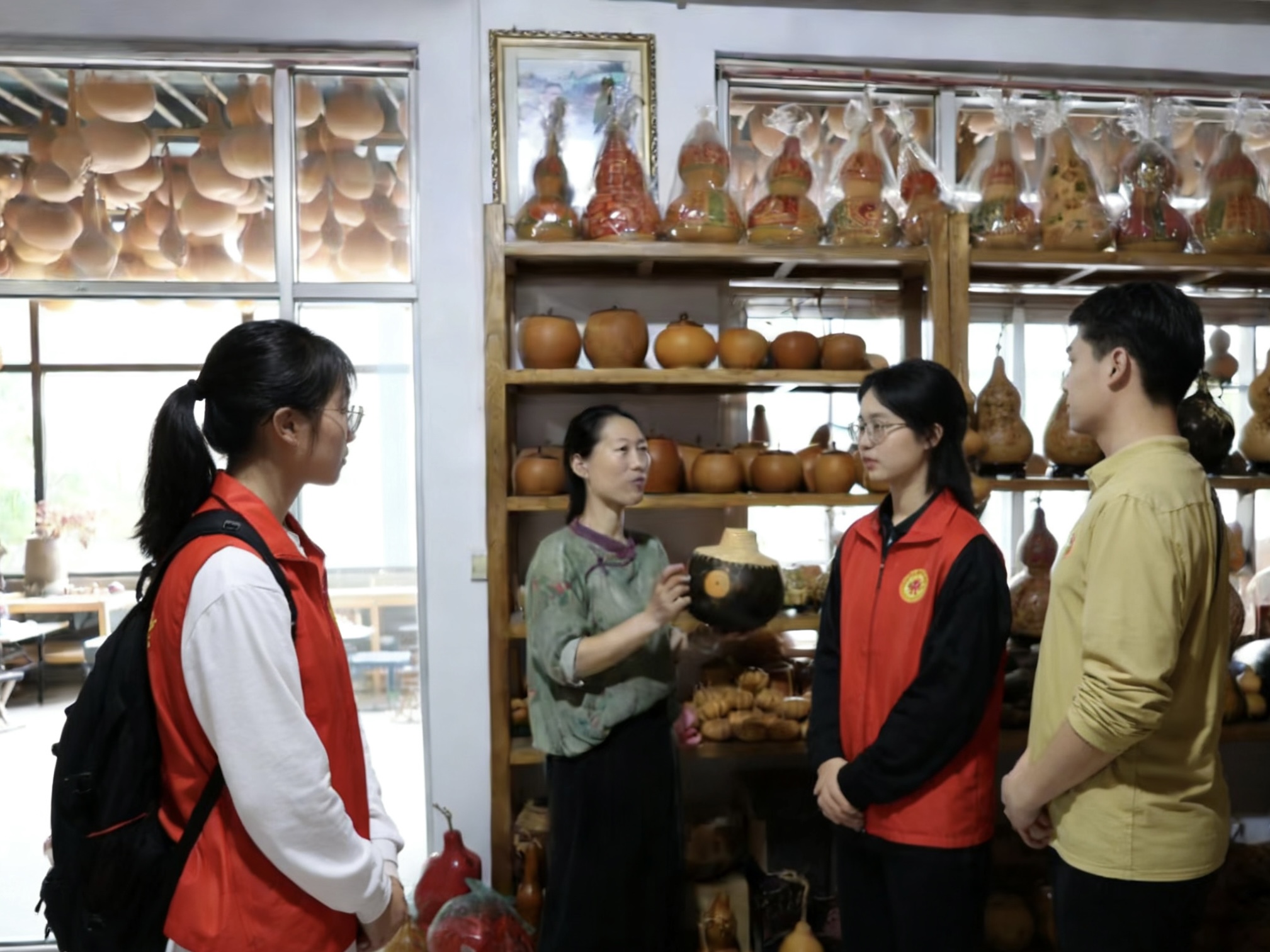 实践队登临光岳楼,在讲解员的引导下,细致观察全木榫卯结构的营造技艺,解读檐角风铃、碑刻题咏中的历史信息,感受这座650余年古建承载的黄河与运河文明交融印记。随后,成员们以随机访谈的形式与来自各地的游客交流,记录他们对光岳楼历史价值的认知以及对黄河文化传播的建议。访谈中,不少游客表示:“光岳楼不仅是建筑奇迹,更是鲁西黄河文化的活化石。”这让成员们更深刻地体会到文化地标在公众认知中的传播作用。活动最后,成员们走进古城非遗工坊,体验木版年画、东昌葫芦雕刻等传统技艺,与非遗传承人探讨“技艺传承与市场活化”的平衡路径,结合专业视角提出“农文旅融合赋能传统技艺传承”的思考。通过现代农业经营模式、信息化文旅传播与传统手工工艺的有机整合,实现非物质文化遗产的动态传承与产业化发展。